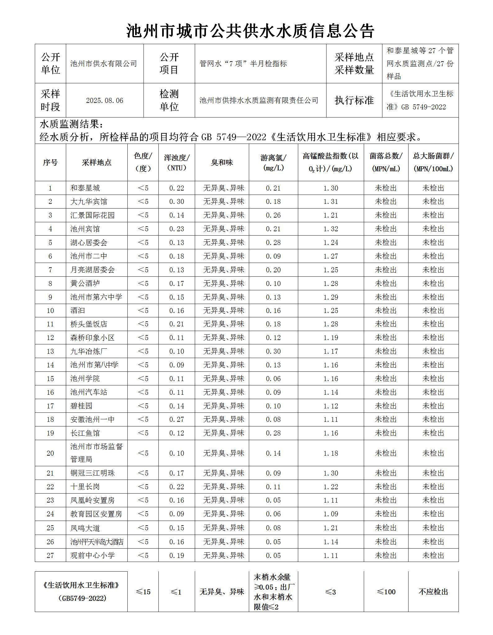 | 池州市城市公共供水水質(zhì)信息公告管網(wǎng)水“7項”半月檢指標(biāo)20250806 | |