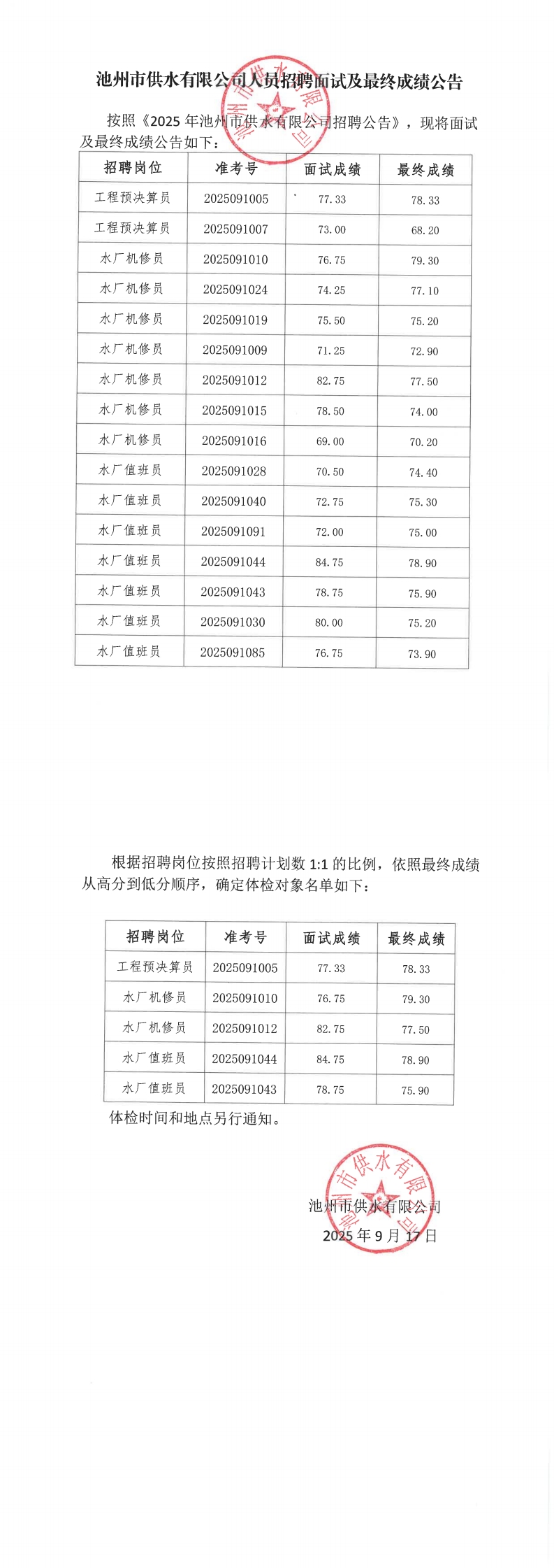 | 池州市供水有限公司人員招聘面試及最終成績公告 | |