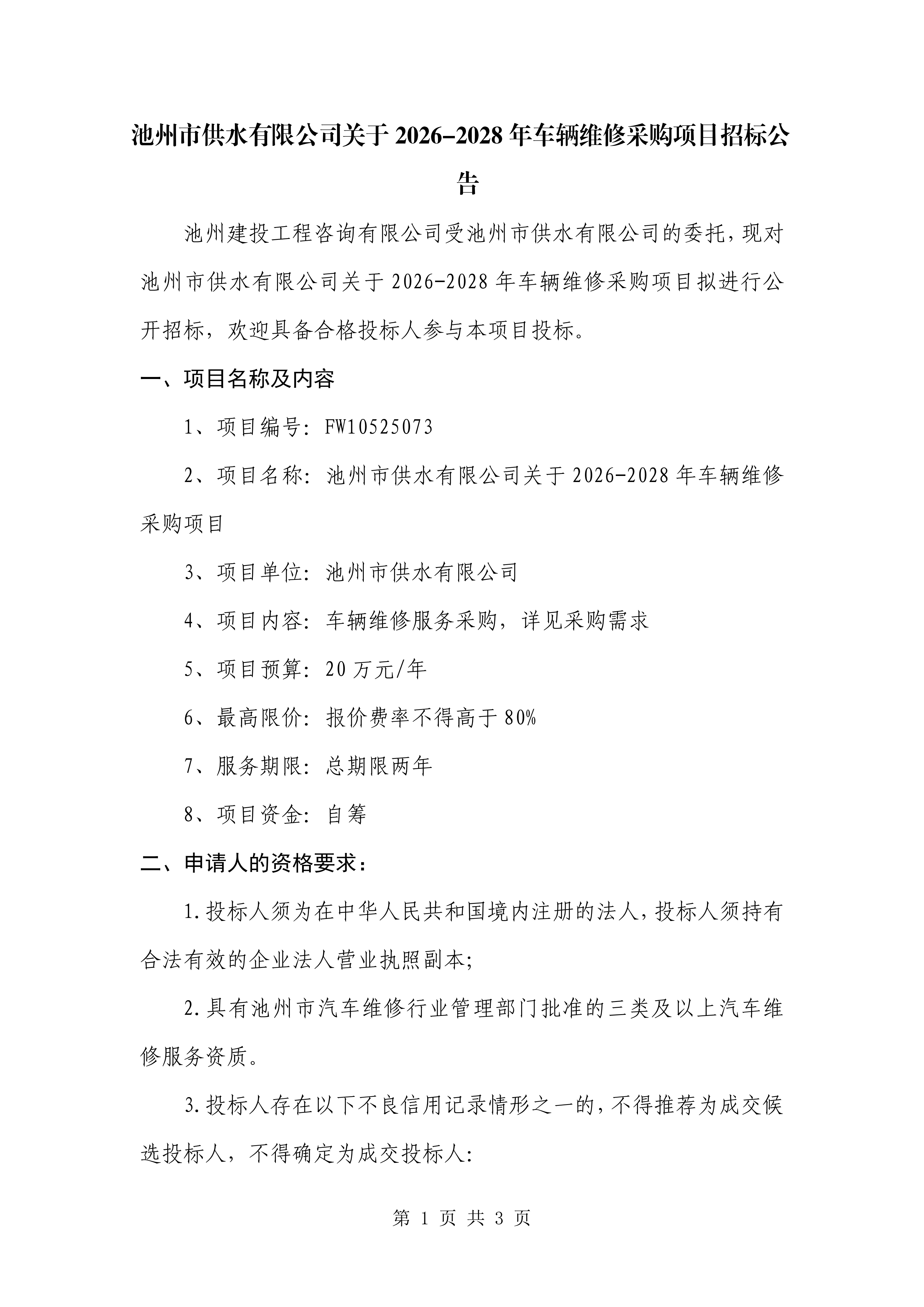 | 池州市供水有限公司關(guān)于2026-2028年車輛維修采購項目招標公告 | |